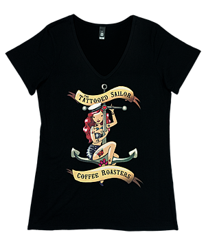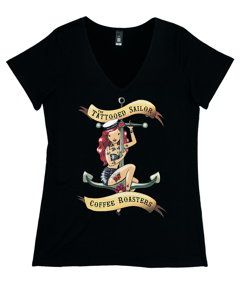 High-quality black women's t-shirt sporting a v-kneck and our iconic tattooed sailor.